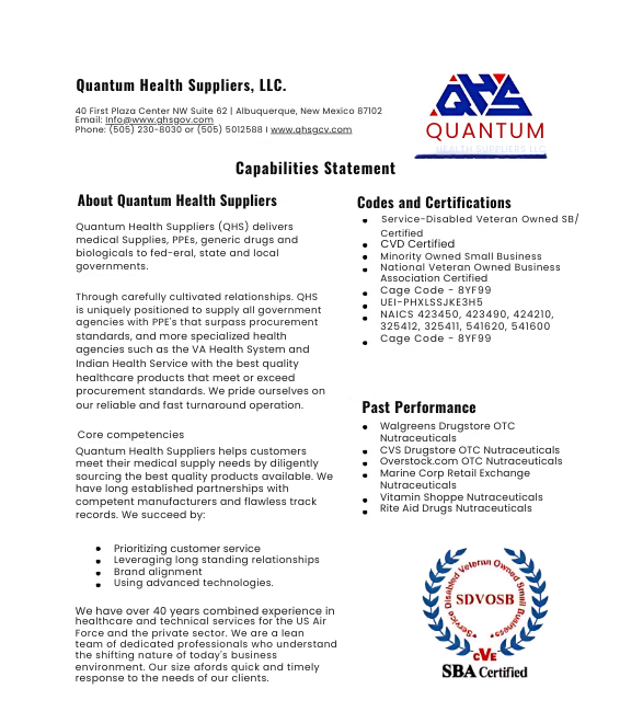 Quantum Health Suppliers (QHS) delivers medical supplies, PPE, generic drugs, and biologicals to federal, state, and local governments. Through carefully cultivated relationships, QHS is uniquely positioned to supply all government agencies with PPE that surpass procurement standards and more specialized health agencies such as the VA Health System and Indian Health Service with the best quality healthcare products that meet or exceed procurement standards. We pride ourselves on our reliable and fast turnaround operation.